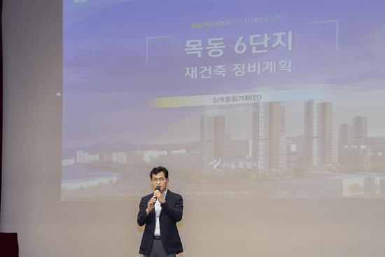 ▲ 지난해 8월 목동아파트 6단지 재건축 신속통합기획(안) 주민설명회에서 인사말씀 중인 이기재 양천구청장 |
