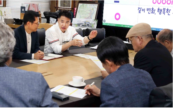 ▲ 오언석 도봉구청장이 사단법인 도봉서원 남궁온 원장 및 이사진들과 영국사 유구보존 및 도봉서원 중건에 대해 논의하고 있다 |