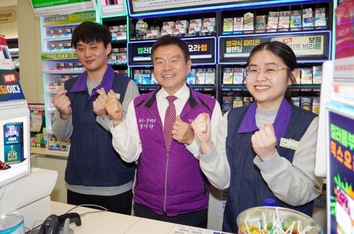 ▲ 이필형 동대문구청장이 ‘CU 전농우리점’에서 근무하고 있는 자활근로자들을 격려하고 있다. |