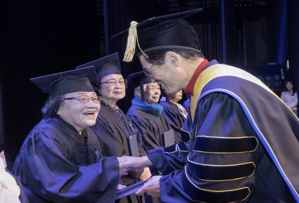 ▲ 지난해 장수문화대학 통합수료식에서 수료증을 전달중인 이기재 양천구청장 |