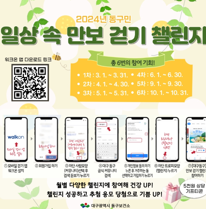 [뉴스서울] 대구 동구보건소는 3월부터 10월까지 ‘워크온 앱’을 활용한 ‘일상 속 만보 걷기 챌린지’를 운영한다.
