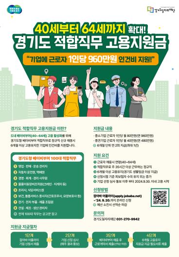 경기도 적합직무 고용지원금은 경기도형 베이비부머 100대 적합직무에 속한 50대 도민을 정규직으로 채용하는 도내 중소·중견기업에 1인당 최대 960만 원을 1년간 지원하는 사업이다. 상반기 모집은 3월부터 5월까지 진행되어 324개 사, 993명 신청했다.