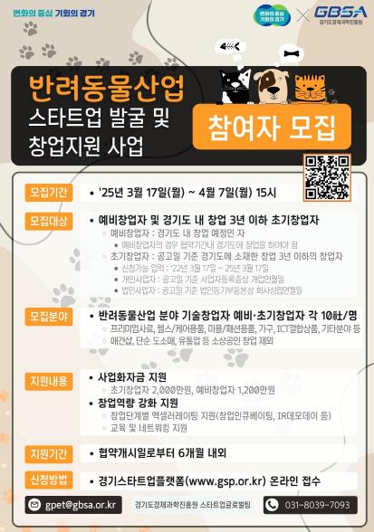 변희정 경기도 반려동물과장은 “반려동물산업은 단순한 반려문화를 넘어 동물복지와 공존의 가치를 실현하는 중요한 분야”라며 “올해도 이 사업을 통해 혁신적인 스타트업을 발굴·육성하고, 반려동물과 사람이 함께 행복한 경기도를 만들어가겠다”고 말했다.
