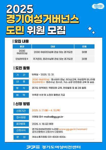 [뉴스서울] 경기도여성비전센터가 4월 10일까지 도민․전문가․공공기관 거버넌스로 여성가족 정책을 협력하는 ‘경기여성거버넌스’ 2025년 분과 위원을 모집한다.