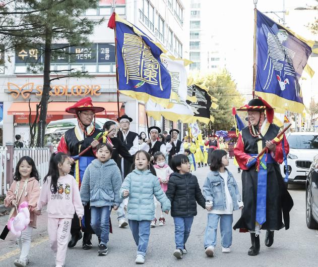 ▲ 2023 인선왕후축제 ‘인선왕후 가례의식’. 임병택 시흥시장과 아이들이 함께 행진하고 있다. |