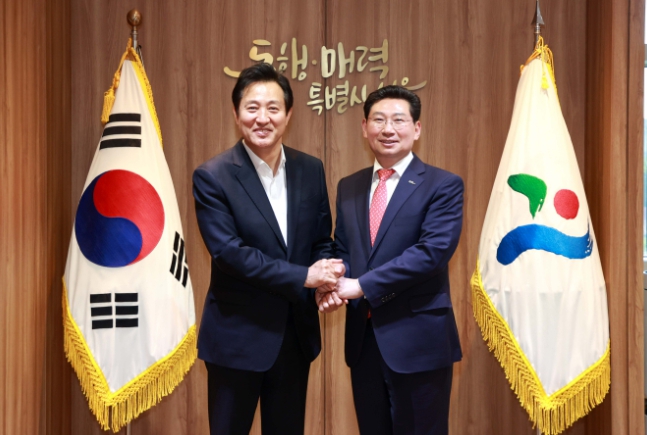 | ▲ 2023년 5월 이상일 용인특례시장(우)이 오세훈 서울시장(좌) 간담회 후 기념촬영을 하고 있다 |