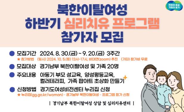[뉴스서울] 경기도가 직접 운영하는 경기남부 북한이탈여성 상담 및 심리치유센터에서 오는 20일까지 하반기 심리 치유 프로그램 참가자 20명을 모집한다.