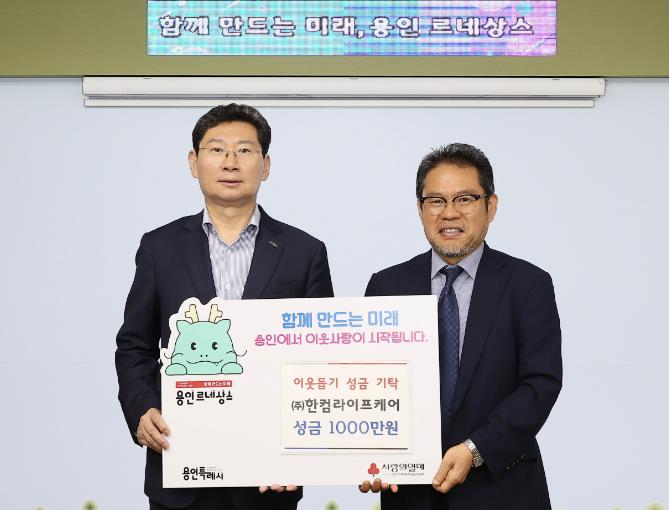 | ▲ 이상일 용인특례시장(왼쪽)이 10일 시청 접견실에서 (주)한컴라이프케어 오병진 대표(오른쪽)와 만나 간담회를 가졌다. 이날 오병진 대표는 이웃돕기 성금 1000만원을 용인특례시에 전달했다. |