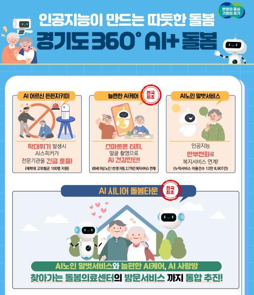 2028년 경기도는 노인인구가 전체 인구의 20%를 차지하는 초고령사회로 진입하게 된다. 핵심과제가 된 노인돌봄 문제에 대비해 경기도는 인공지능(AI) 기술을 적극 활용한 돌봄체계를 만들어 나가고 있다. 특히 올해는 도내에서 노인인구 비율이 가장 높은 포천시 관인면을 지정해 다양한 돌봄서비스를 제공하며 인공지능 기반 노인 돌봄 사업의 시작을 알렸다. 올해 경기도가 도입한 인공지능 기반 노인 돌봄 사업을 정리해 봤다.