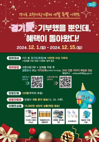 정구원 경기도 자치행정국장은 “연말정산 시기를 앞두고 고향사랑기부제의 인지도를 높여 기부문화를 확산하기 위해 이벤트를 준비했다”면서 “세액공제나 답례품 외 추가 혜택이 제공되는 만큼 많은 참여를 바란다”고 말했다.