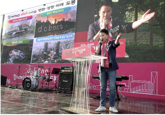 ▲ ‘제29회 도봉구민의 날 축제’에서 오언석 도봉구청장이 민선8기 핵심사업에 대해 브리핑하고 있다 |