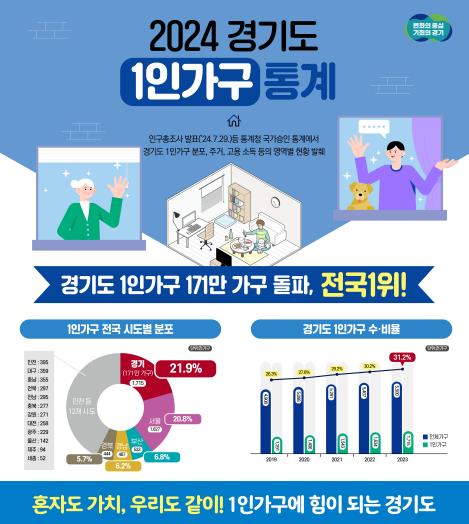 경기도의 1인가구 수는 전년(163만) 대비 약 8만 가구가 증가한 171만5천 가구로 집계됐으며, 이는 도 전체 가구(550만) 중 31.2%를 차지한다. 경기도의 1인가구 수와 비중은 매년 증가세를 보이고 있으며 전국 1인가구의 21.9%가 경기도에 거주하는 것으로 조사됐다. 1인가구 수는 2020년부터 서울시를 넘어서 매년 전국 1위를 기록하고 있다.