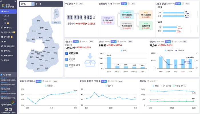 경기도일자리상황판은 고용, 산업, 경제, 인구 등 다양한 데이터를 통합해 지역별 일자리와 경제 흐름 변화를 종합적으로 파악할 수 있도록 구축된 데이터 기반 정책 지원 플랫폼이다.