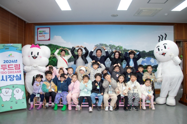 올해 첫 두드림 시장실을 방문한 샛별어린이집(원장 이현민) 21여 명의 원아들은 시장님과 반갑게 인사 후 대화의 시간을 가지고 각 시청부서 체험에 들뜬 모습을 보였다.