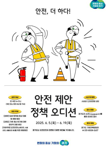[뉴스서울] 경기도가 6월 5일부터 19일까지 전국민을 대상으로 ‘안전제안 정책오디션 2025’ 공모전을 진행한다.