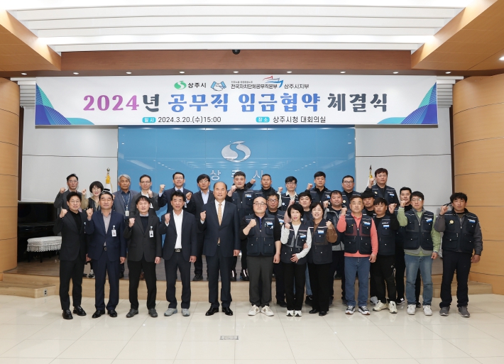 [뉴스서울] 상주시와 전국공공운수사회서비스노동조합 전국자치단체공무직본부 상주시지부는 3월 20일 오후 3시 시청 대회의실에서 ‘2024년 공무직 임금협약 체결식’을 가졌다.