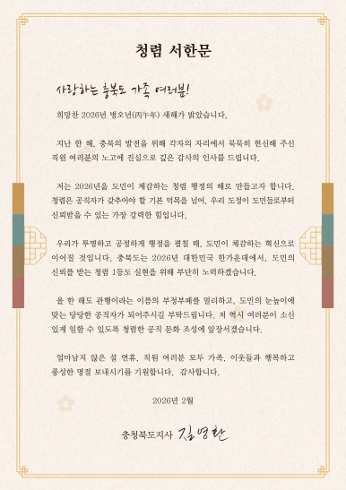 이어 “충북도는 2026년 대한민국 한가운데에서 도민의 신뢰를 받는 청렴 1등 도 실현을 위해 부단히 노력하겠다”며, 관행이라는 이름으로 이어져 온 부정부패를 멀리하고 도민의 눈높이에 맞는 당당한 공직자상을 확립해 줄 것을 당부했다.