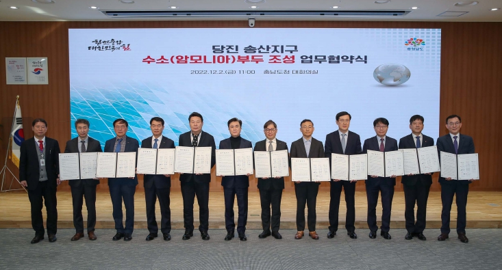 ▲ 2022년 12월 2일 충남도청 대회의실에서 김태흠 지사가 오성환 당진시장, 최익훈 에이치디시(HDC)현대산업개발 대표이사를 비롯한 9개 기업 대표 등과 ‘송산 수소(암모니아) 부두 조성을 위한 업무협약’을 체결했다. |