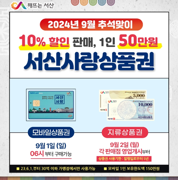 이완섭 서산시장은 “서산사랑상품권의 9월 확대 발행을 통해 추석 멸절 시민의 가계 부담을 덜고, 물가 상승과 경기 침체로 위축된 소비를 촉진해 소상공인 매출 및 골목상권 활성화에 도움이 되길 바란다”라고 말했다.