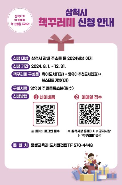 주소지가 삼척시인 2024년생 출생 아동은 누구나 책꾸러미 신청이 가능하며, 자세한 사항은 삼척시청 홈페이지에서 확인할 수 있고 문의사항은 삼척시 평생교육과로 연락하면 된다.