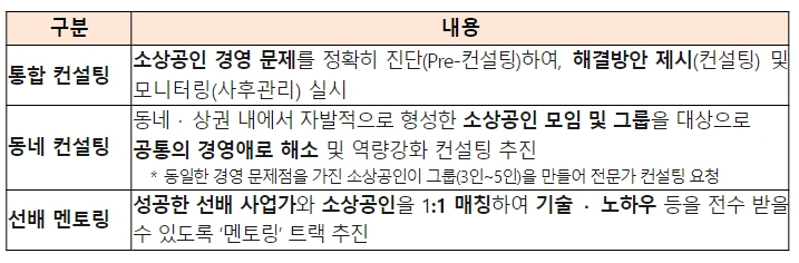 먼저, 성공한 선배 사업가의 경험・노하우를 전수해주는 ‘선배 상담(멘토링)’과, 소상공인 모임・그룹의 공동애로를 해결해주는 ‘동네 상담(컨설팅)’을 신설하여 추진한다.