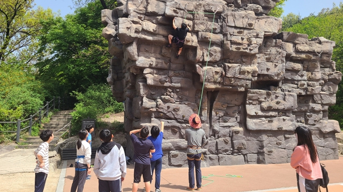 ▲ 배봉산 인공암벽장에서 암벽등반 체험하는 학생들 |