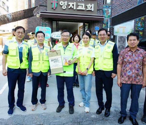 특히, 이날은 단순한 환경 정화 활동을 넘어 아침 골목청소를 통해 구민과의 소통을 강화하고자 노력하는 류경기 구청장을 위한 특별한 자리가 이어졌다. 주민들은 류 구청장에게 그동안의 헌신과 노고에 대한 감사의 의미로 ‘임명장’과 상징적인 ‘황금색 빗자루’를 수여하며, 그를 ‘골목청소왕’으로 임명했다.