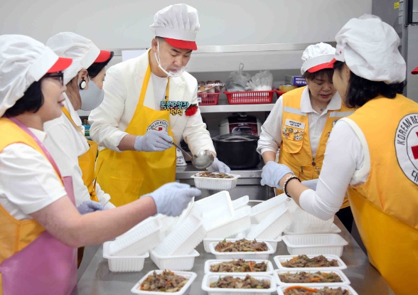 ▲ 오언석 도봉구청장이 적십자사봉사회원들과 함께 어르신들께 드릴 건강식을 준비하고 있다 |