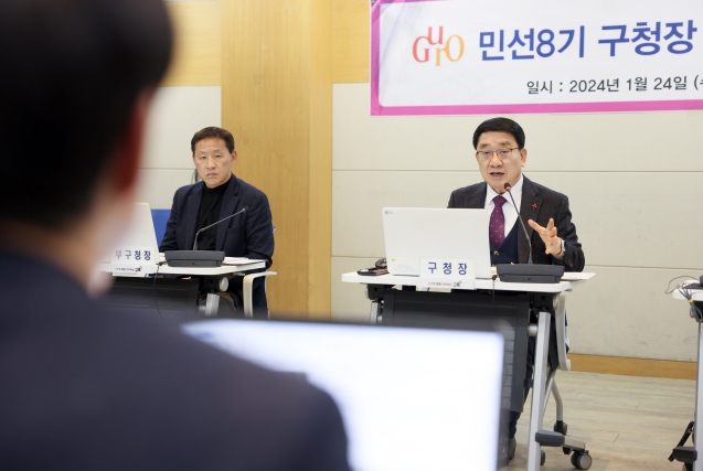 ▲ 문헌일 구로구청장(사진 오른쪽)이 지난 1월 24일 열린 ‘민선8기 구청장 공약사업 검토보고회’에서 발언하고 있다. |