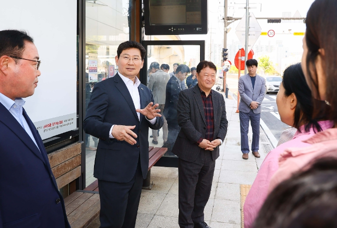 [뉴스서울] 이상일 용인특례시장은 지난 22일 용인성산초등학교를 방문해 학교 측 요청을 수용해 시가 설치한 체험학습용 버스정차장과 반사경의 모습을 살펴보고, 학부모 등과 간담회를 가졌다.