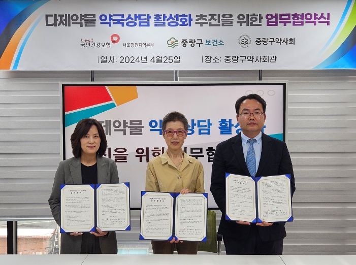[뉴스서울] 중랑구 보건소가 지난 25일, 국민건강보험공단 서울강원지역본부, 중랑구약사회와 함께 다제약물 관리사업 관련 상호협력 업무 협약을 체결했다.