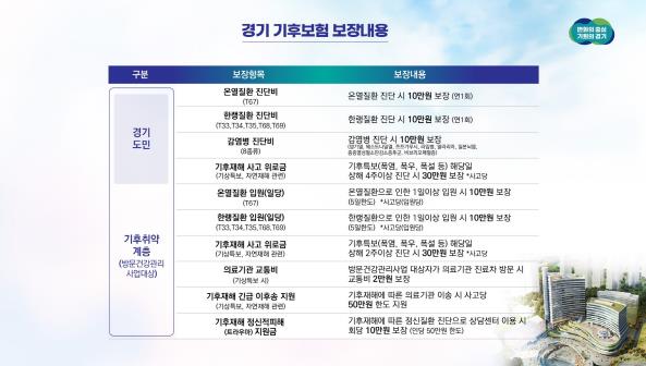 특히 기후취약계층(시군 보건소 방문건강관리사업 대상자) 16만여 명은 위 보장항목에 더해 ▲온열질환․한랭질환 입원비 ▲기상특보 시 의료기관 교통비 ▲기후재해 시 구급차 이후송비 ▲기후재해 정신적피해 지원을 추가로 보장받을 수 있다.
