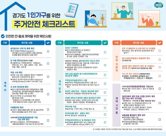 경기도는 1인가구의 전세사기 피해를 막고 안전한 주거 생활을 돕기 위해 개발한 ‘1인가구 주거안전 체크리스트’를 경기도 1인가구 포털에 공개했다고 15일 밝혔다.