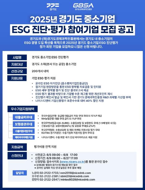 공정식 경기도 사회혁신경제국장은 “ESG 진단부터 개선까지 한 번에 지원해, 중소기업이 ESG를 새로운 성장 동력으로 삼을 수 있도록 적극 뒷받침하겠다”며 “중소기업의 ESG 경영 인식을 높이고, 실질적인 혜택을 제공함으로써 기업의 글로벌 경쟁력 제고와 지역경제의 지속가능한 성장 기반이 마련되길 바란다”고 말했다.