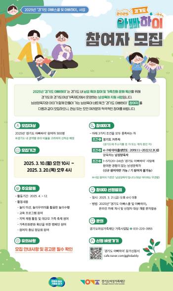 우선 상반기에는 ‘경기도 아빠하이’ 참여자 모집을 시작한다. 참여대상은 유아기 자녀(2019년생~2022년생)를 둔 도내 남성양육자로 놀이미션 제공, 놀이꾸러미 배포, 교육, 체험활동 등의 프로그램을 제공한다. 오는 20일까지 선착순 모집으로 자세한 내용은 경기도여성가족재단 누리집에서 확인할 수 있다.