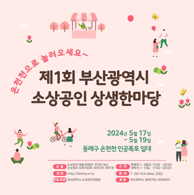[뉴스서울] 부산시는 내일(17일)부터 19일까지 동래구 온천천 인공폭포 일대에서 소상공인 제품 소비촉진을 위한 '제1회 부산시 소상공인 상생한마당' 행사가 열린다고 밝혔다.