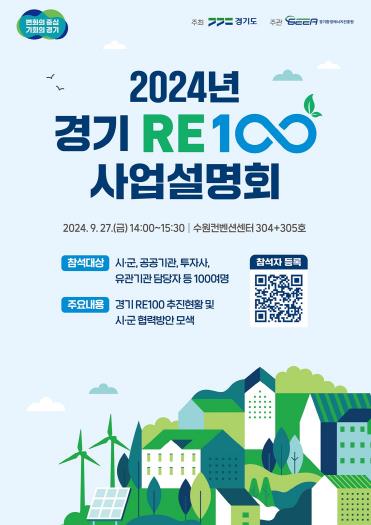 경기도는 27일 수원컨벤션센터에서 31개 시군을 대상으로 한 ‘2024년 경기 RE100 사업설명회’를 열고 이 같은 내용을 공유한다. 이번 설명회에는 도내 시군 및 공공기관 관계자, 투자사, 유관기관 등 약 100명이 참석한다.