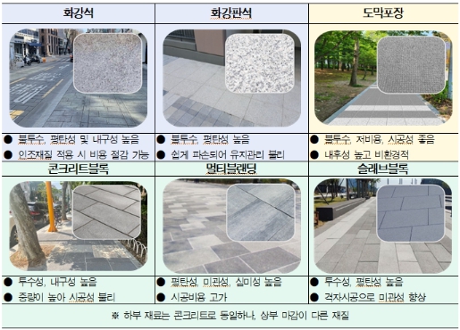 기본적으로 보도블록포장 재질은 빗물 흡수와 물고임을 막고 열섬현상을 완화할 수 있는 투수성 재질을 우선 사용한다. 역사성을 간직한 행주산성, 서오릉 일원에는 주변 경관과 어우러지는 화강석과 화강판석을 함께 사용하고, 특화가로 조성이 필요한 지역에는 맞춤형 별도 재질을 사용한다.