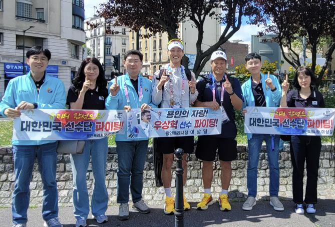 ▲ 이상일 용인특례시장은 7일(현지시각) 파리 올림픽 높이뛰기 예선을 통과한 우상혁 선수를 현지에서 응원하고 격려했다 |