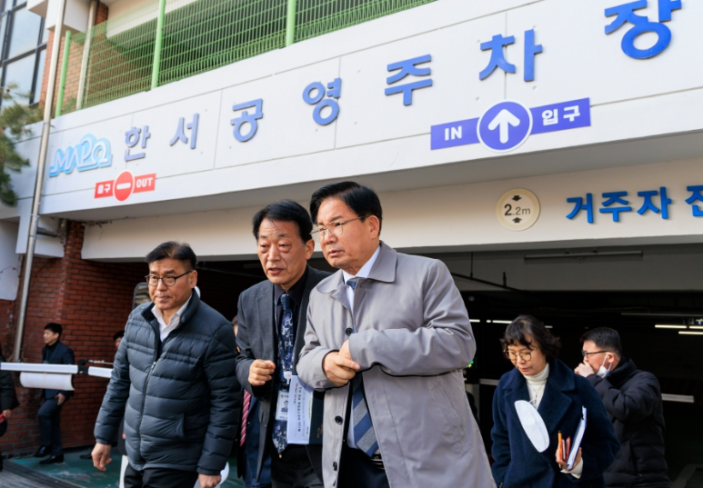 ▲ 지난 2월 박강수 마포구청장이 시설 및 운영 개선을 위해 한서공영주차장을 방문을 했다. |