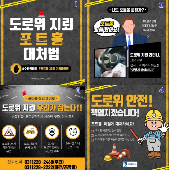 수원시는 최근 포트홀 대처법, 수원시의 포트홀 대응 정책 등을 안내하는 카드뉴스 ‘도로 위 지뢰 포트홀 대처법’을 제작해 시민들에게 대처 방법을 적극적으로 홍보하고 있다.