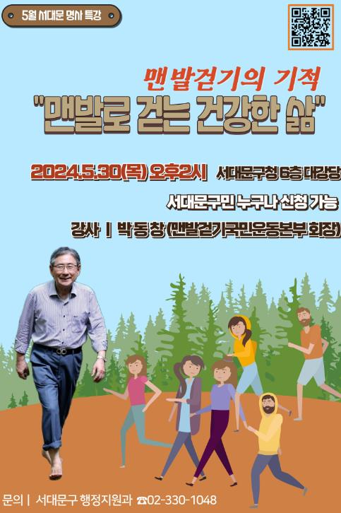 [뉴스서울] 서대문구가 이달 30일 오후 2시 구청 대강당에서 ‘맨발 걷기의 기적-맨발로 걷는 건강한 삶’이란 주제로 5월 서대문 명사특강을 연다.