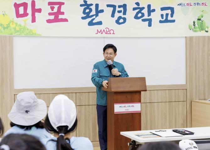 ▲ 마포 환경학교에서 박강수 구청장이 학생들에게 환경보호의 중요성에 대해 설명하고 있다 |