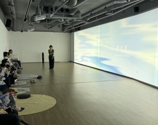 ▲ 첫 전시 기념 이벤트로 홍나겸작가가 도슨트 하고 있는 모습 |