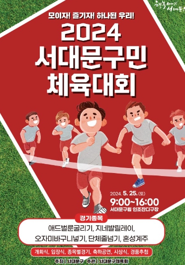 [뉴스서울] 서대문구가 ‘모이자! 즐기자! 하나 된 우리!’란 캐치프레이즈 아래 이달 25일 오전 9시부터 오후 4시까지 서대문구립인조잔디구장에서 ‘2024년 서대문구민체육대회’를 개최한다.