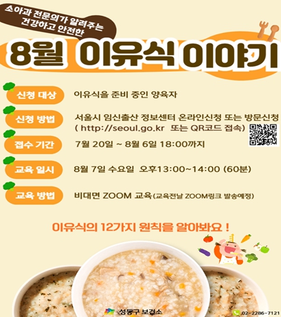 비대면 육아교실 이유식 특강은 8월 7일 오후 1시부터 1시간 동안 비대면으로 이뤄지며, 희망자는 6일까지 서울시 임신·출산 정보센터 누리집을 통해 신청할 수 있다. 보다 상세한 내용은 성동구보건소 누리집 공지사항을 통해 확인하거나 구 보건소 건강관리과로 문의하면 된다.