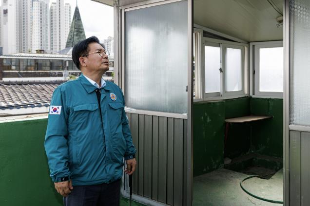 ▲ 옥탑의 오래된 창호를 살펴보고 있는 박강수 마포구청장 |
