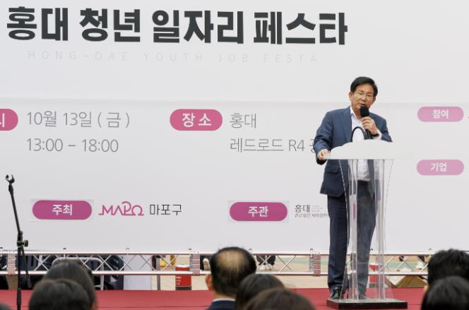 ▲ 홍대 청년 일자리 페스타에서 인사말을 전하는 박강수 마포구청장 |