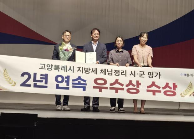 ▲ 2024년 7월 16일 직원 월례조회에서 이동환 고양특례시장과‘고양시 지방세 체납정리 시·군평가 2년 연속 우수상 수상' 기념촬영 |