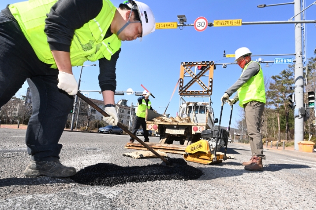 | ▲ 시민들의 안전을 확보하기 위해 수원시가 운영하고 있는 ‘포트홀 25시 기동대응반’ 작업자들이 도로에 발생한 포트홀을 긴급히 보수하고 있다. |